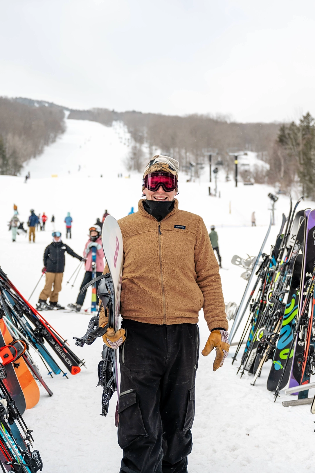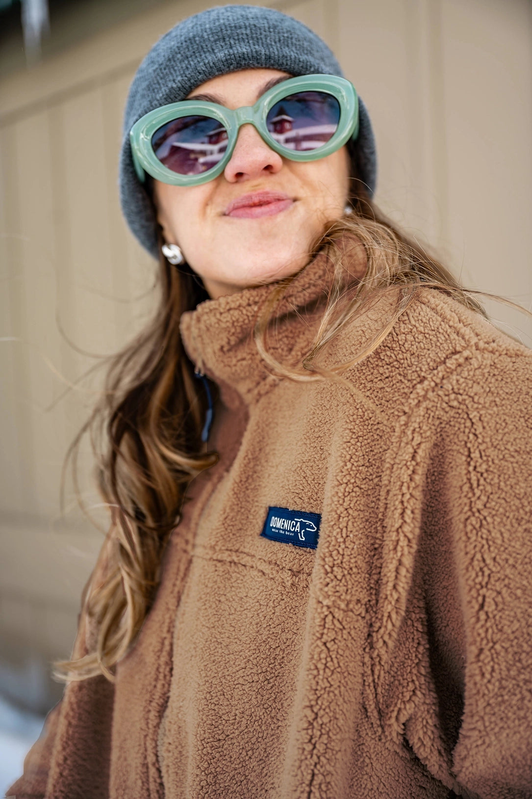 Effortless comfort meets timeless style. Crafted from plush camel sherpa fabric with a deep navy cotton lining, this jacket keeps you warm on chilly days while offering a classic, versatile look. Features include tone-on-tone chest-length zipper and practical pockets, blending functionality with understated design.